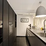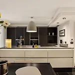 Ein Herd und ein Geschirrspüler sind in einer voll ausgestatteten Küchenzeile zu finden. Das Apartmaji Portoroz - Portoroz Mansion Suites ist in unmittelbarer Nähe von der Bushaltestelle Fizine.
